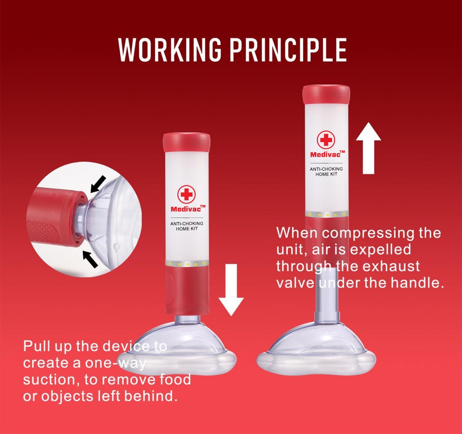 - Medivac⢠creates a strong yet safe suction to dislodge airway obstructions. By placing the mask over the mouth and nose, pressing to create a seal, and pulling the handle, the device generates enough suction to remove the blockage in seconds.