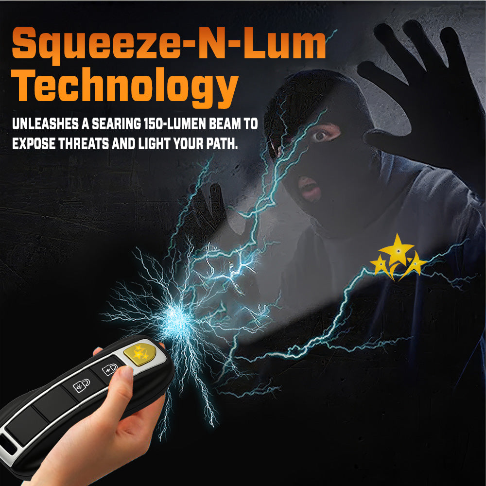 The built-in tactical flashlight unleashes a blinding 150-lumen beam, powerful enough to illuminate dark streets, alleys, parking lots, campsites, or even your car surroundings before you step in. It’s the perfect everyday device for nighttime safety, giving you the power to see clearly and react fast - before danger even gets close.